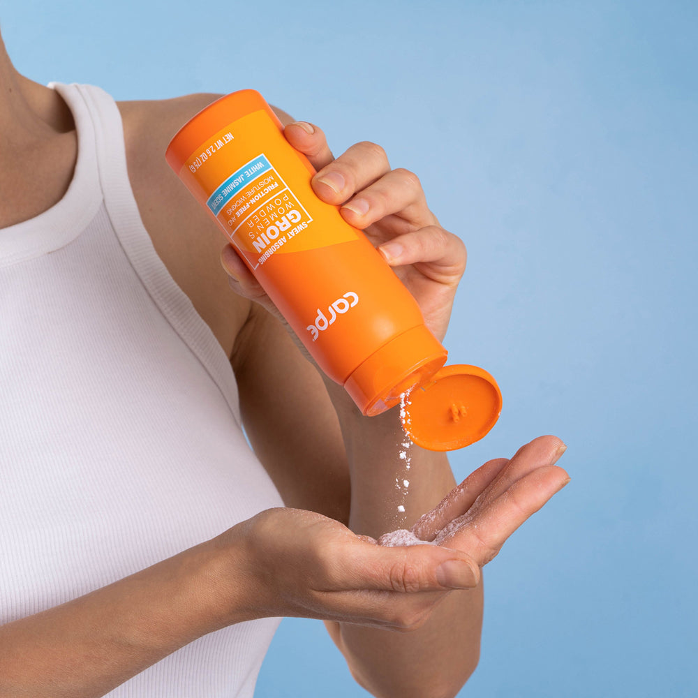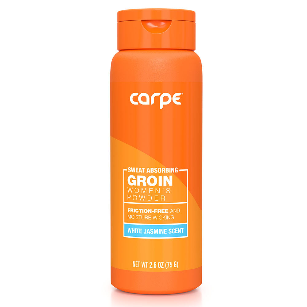- SWEAT ABSORBING SUPER POWDER FOR WOMEN: Most groin powders don’t focus on the problem: the sweat. Say goodbye to the annoying, sticky, unclean feeling of a sweaty groin. Carpe’s powder combines some of the most effective sweat and moisture-absorbing ingredients available, to deliver maximum targeted wetness relief with a convenient shake bottle.